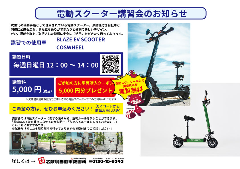 講習費用は5000円かかりますが、教習所で電動スクーターを購入する場合に使える5000円分のクーポンがもらえますので、電動キックボードを購入するのであれば講習料は実質無料です。