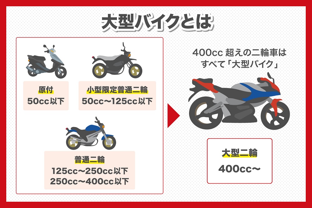そもそも大型バイクとは、400㏄を超える排気量の大きい二輪車を指します。車体は大きく頑丈で、重量も数百kgほどになるのが特徴です。