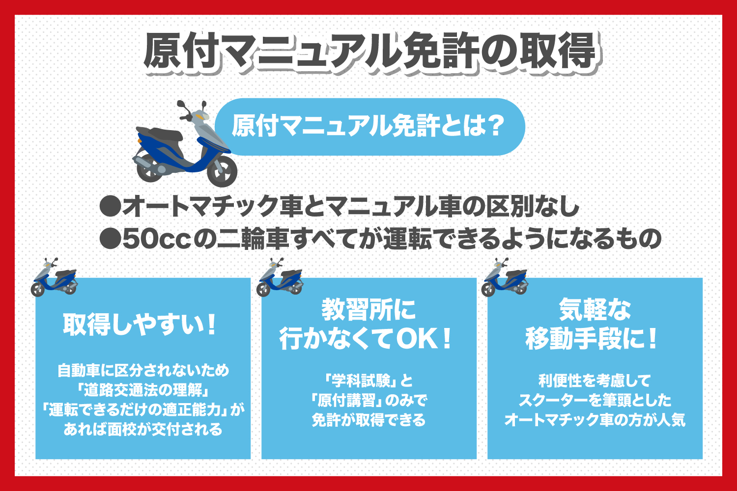 原付免許はオートマチック車とマニュアル車の区別がないので、原付マニュアル免許は「原付免許」のことを指します。原付免許を取得すれば、50㏄の二輪車全てが運転できるようになるので、安心して取得してください。
