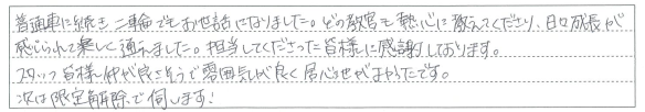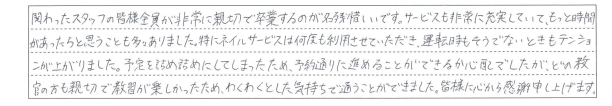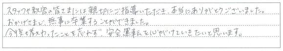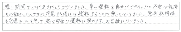 短い期間でしたがありがとうございました。車の運転を自分ができるのかと不安な気持ちが強かったのですが、卒業する頃には運転することが楽しくなってました。