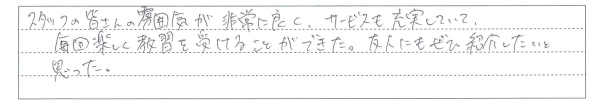 スタッフ皆様仲が良さそうで雰囲気が良く居心地がよかったです。