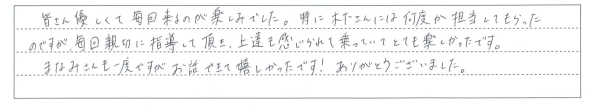 皆さん優しくて毎回来るのが楽しみでした。特に木下さんには何度か担当してもらったのですが、毎回親切に指導して頂き、上達も感じられて乗っていてとても楽しかったです。