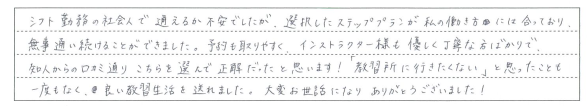 シフト勤務の社会人で通えるか不安でしたが、選択したステッププランが私の働き方には合っており、無事通い続けることができました。予約も取りやすく、インストラクター様も優しく丁寧な方ばかりで、知人からの口コミ通りこちらを選んで正解だったと思います!