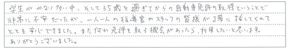 学生がかなり多い中、そして35歳を過ぎてからの自動車免許の取得ということで非常に不安だったが、一人一人の指導官やスタッフの皆様が丁寧に接してくれてとても安心できました。