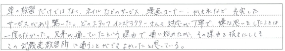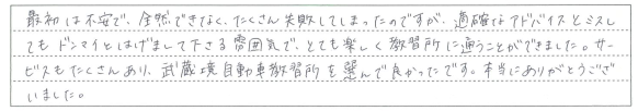 サービスもたくさんあり、武蔵境自動車教習所を選んで良かったです。本当にありがとうございました。