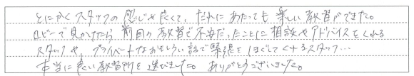 「教習所に行きたくない」と思ったことも一度もなく、良い教習生活を送れました。大変お世話になりありがとうございました!