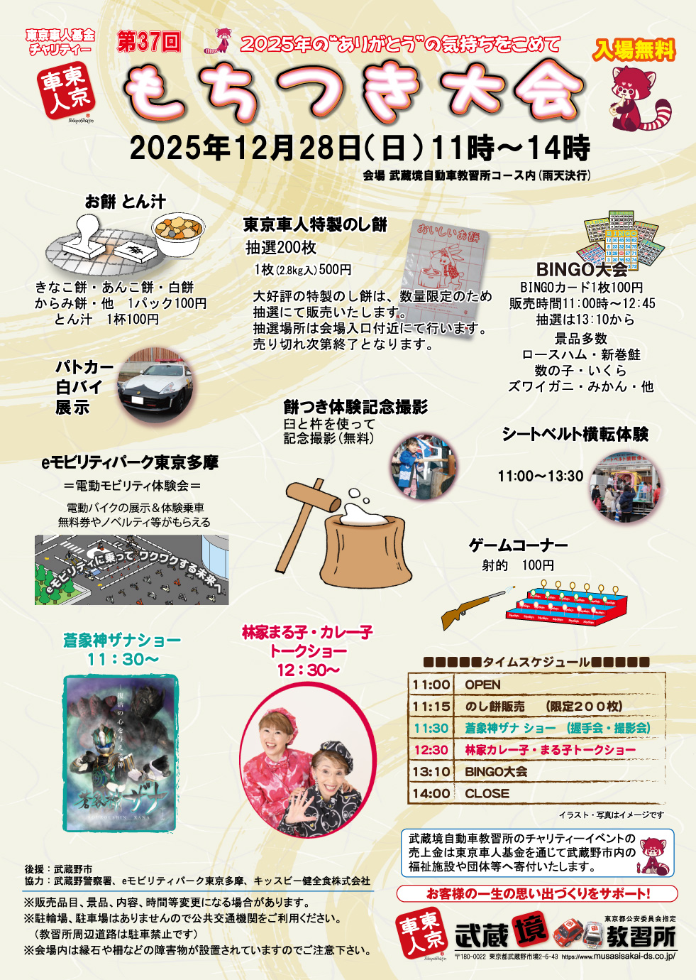2025年12月28日(日)11:00~14:00に『東京車人基金チャリティー第37回もちつき大会』を開催いたします。ご家族・お友達をお誘いの上、ぜひお越しください。